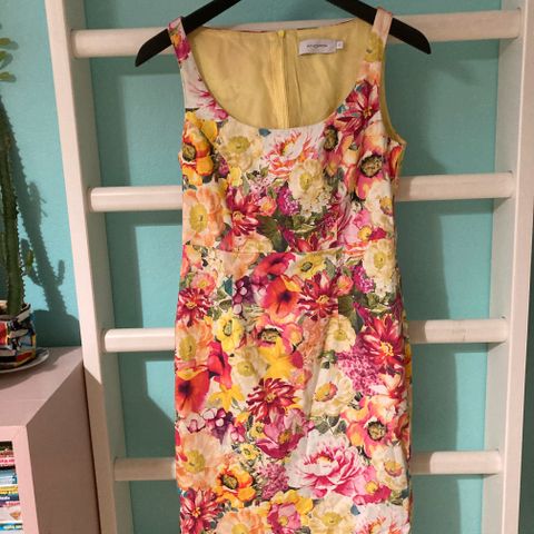 Kukkakuvioitu lyhyt hihaton juhlamekko, koko S. Italialainen Rinascimento merkkinen. Takana vetoketju ja niskassa kaksi nappia sekä solmimisnauhat. Kankaassa hieman kiiltävä pinta. Kokonaan vuoritettu. Runsas helma. Takana pieni melko huomaamaton tahra vetoketjun vieressä (kts.kuva). En ole koettanut poistaa.