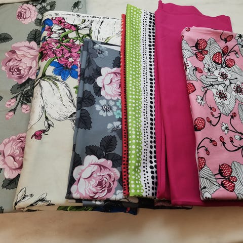 Ommellisesta ostetut luomupuuvillaiset trikoo- ja resorikankaat. Väri turkoosin sininen. Trikoo lev 165 cm ja pituus 175 cm. Resoriputki lev 45 cm (aukileikattuna n. 90 cm) ja pituus 52 cm. Ovh 25 eur/m. Ei pesty eli kutistuu noin 5%. www.ommellinen.fi