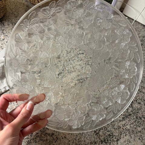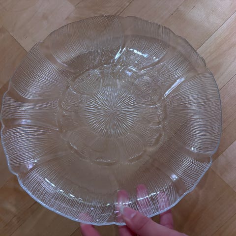 Hyväkuntoinen lasinen tarjoilulautanen, ei virheitä