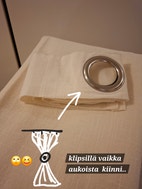 Leikattu tankokuja pois, koska ollut nipsuttimilla kiinni. Tankokujan "lenksuja" käyttänyt sitten verhoa auki pitämiseen isommilla klipsuttimilla.