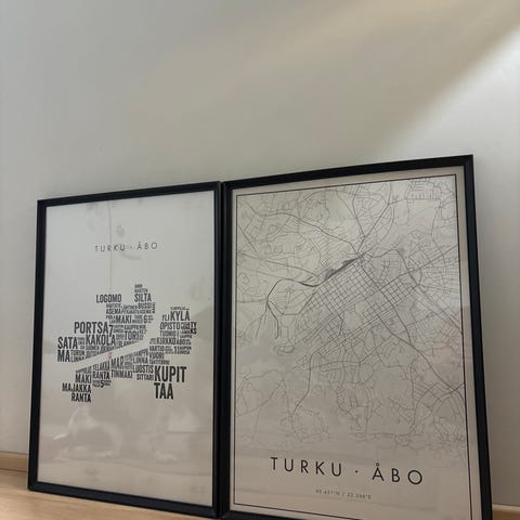Myydään kuvan julisteet kehyksineen. Kehykset Granitista (lasi). Koko noin 32x42cm. Nouto. Maksu mobilepay. Hinta molemmista yhteensä.