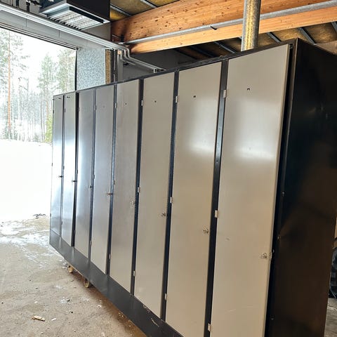 Peltirunkoinen pukukaappi. Avaimella lukittavat lokerot. 4 ovea per kaappi, varastossa vielä 1 kaappi.