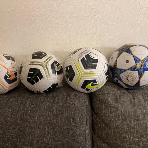 Kolme palloa odottaa taas pääsyä peliin! Jalkapallossa (koko 5, ”FIFA-quality”, 5 eur), pelin jälkiä; niitä selvästi vähemmän sisällä käytetyssä fotsal pallossa, joskin ottanut sekin vähän osumaa ja _hyvin_ haalealla on näkyvissä edellisten käyttäjien eli veljesten nimet, kts. kuva (6 eur).