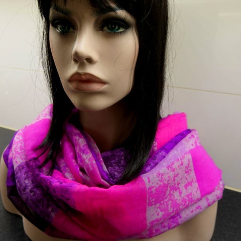 Käyttämätön putkihuivi vielä pakkauksessaan, joka avattu vain kuvaamisen ajaksi. Punaisessa huivissa VAPAA KIERTO -tekstejä. Pakkauksen muovissa kuvia käyttövaihtoehdoista päähän , kaulaan, ranteeseen... multi-funktional headwear.