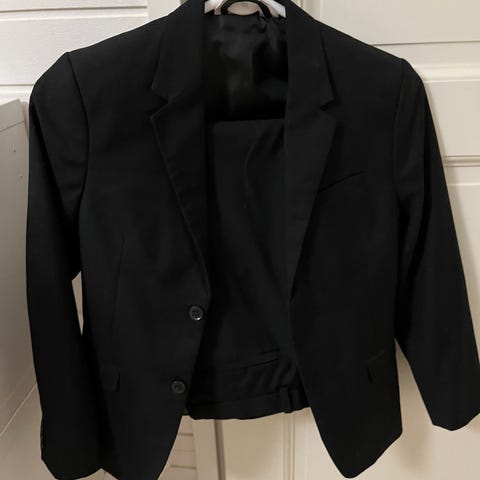 140 cm musta puku, valkoinen kauluspaita ja kengät (36).