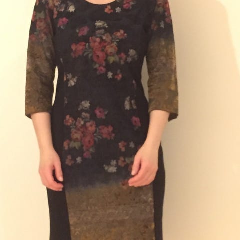 Vilpoisa, tunnetun kotimaisen laatumerkin (Voglia) viskoosimekko hoikalle henkilölle, kaipaa hiukan silitystä ennen käyttöä, koko pesun jälkeen 36-38.