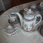 Myydään tarpeettomana hyväkuntoinen Arabian singapore ruskea kahviastiasto. 10 kahvikuppia+ aluslautaset+ leipälautaset. Kahvikannu, sokerikko, kermakko ja iso tarjoilulautanen. Piippuleimalla paitsi yksi kahvikuppi lautasineen, jossa on myös kultareuna. Hinta 320e. Kulkeutuu tarvittaessa Jyväskylään.