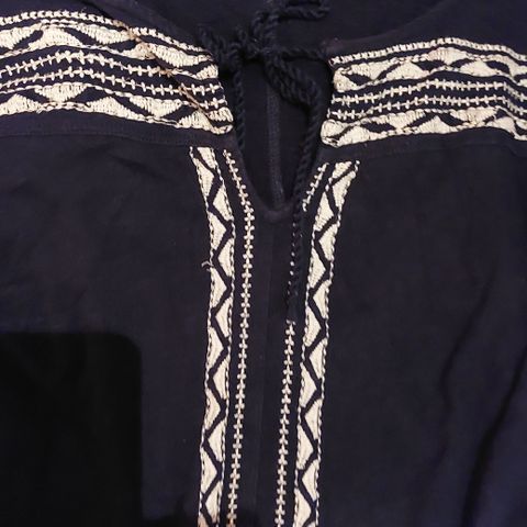 Hyväkuntoinen, käyttämättä jäänyt musta tunika. Edessä pienet rypytykset kaula-aukolla. Väljenevä malli helmaa kohti. Helma takaa hieman pidempi.
