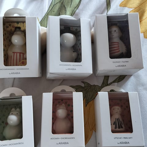 Myydään neljä posliinista muumifiguuria. Eivät ole aitoja, vaan ulkomailta tilattu.