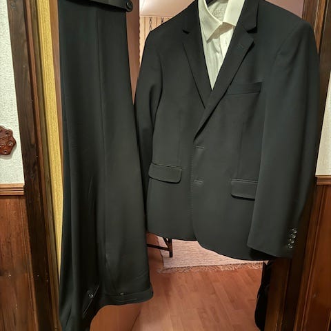 Siisti puku, ollut päällä noin 4 kertaa. Pesty pesulassa. Itse 175cm / 80kg, kuvassa näkyy miten istuu. Mukaan Dressmanin pussi puvulle.