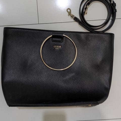 Kaunis ja tilava Guessin maksilaukku, jossa on monogrammikuosi nahkaa ja kangasta – kuin uusi. Ei varmaan kertaakaan käytetty, sisäpuolikin priimaa ja dustbag löytyy.