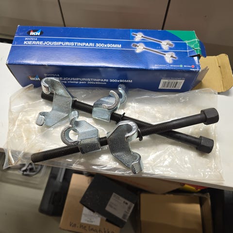 Myydään kuvan ja otsikon mukaiset moitteettomassa kunnossa olevat yleismalliset jousipuristimet. Sopii lähes kaikkiin ajoneuvoihin. Puristimien pituus 370mm.