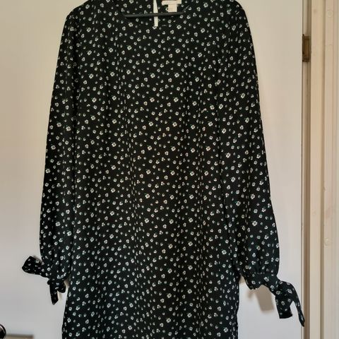 Musta mekko, laskeutuvaa kangasta. Yläosassa pitsiä. Väri täysin Musta ja haalistumaton. Kuva vähän vääristää.