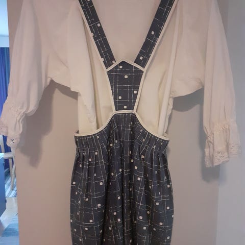 Koko settiin kuuluu: Punaiset sukkahousut, valkoinen aluspaita, vihreä-punainen mekko, valkoinen esiliina ja hiusnauhat.