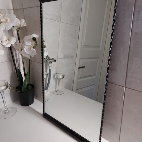 Ikean tuotekoodi 100.738.78. Itse peili on täydellisessä kunnossa, mutta mustaa mokka"nahka"kehystä ovat lapset raaputtaneet kuten kuvasta näkyy. Voi ottaa käyttöön sellaisenaan, tai tuunailla itse tyylikkäämpää pintaa kehykseen. Hyvä aihio kehittää vaikka mitä. Noudettavissa Helsingin Östersundomista, tai voin tuoda välille Östersundom-Vallila.