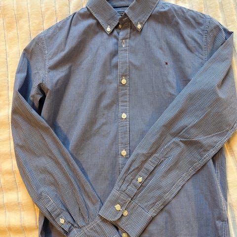 Uudenveroinen Tommy Hilfigerin kauluspaita koossa 176 cm. Vaaleansininen/valkoiset raidat ja pilkut. Pesun jäljiltä ryppyinen.