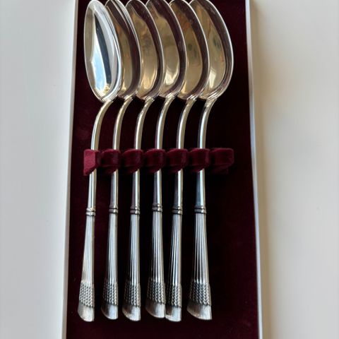 7 lusikkaa, ei kaiverruksia. Jääneet käyttämättä mutta jotain kulumaa ja tummumista tullut säilytyksessä.