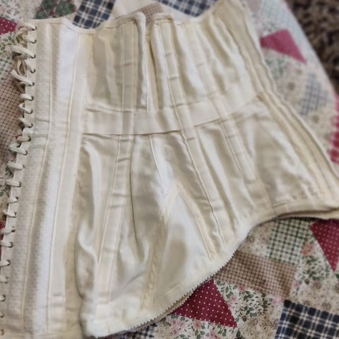 Itse ommeltu korsetti. Sopii esimerkiksi hääpuvun yläosaksi erillisen alaosan kanssa. Päälikangas pellavaa, vuori puuvillaa. Kevyt ja hieman taipuisa ”luusto”. Yläreunassa koristepitsi. Nauhoitus takana ja edessä hakaskiinnitys. A-tai B-kuppi. Noin kokoa 38.