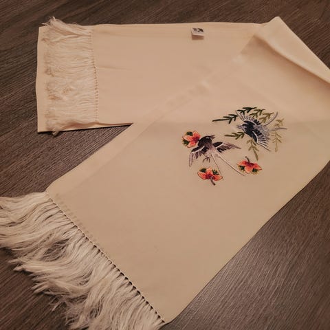 Kaunis huivi tai liina, 32 x 214 cm, kaksipuolinen tikattu kangas (hieman jäykkä).