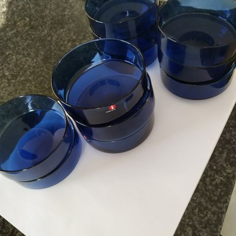 Kuva 4 ja 5. Jälkiruokakulho, halkaisija 10 cm, korkeus 4 cm, 11 kpl, virheettömiä, osassa vielä kolmiotarra, valmistus 1958 -1970, 7 eur kpl
