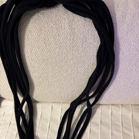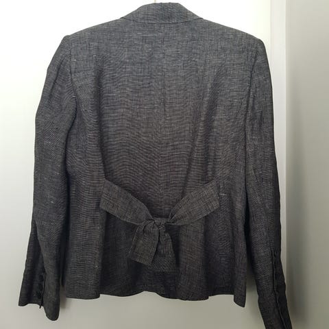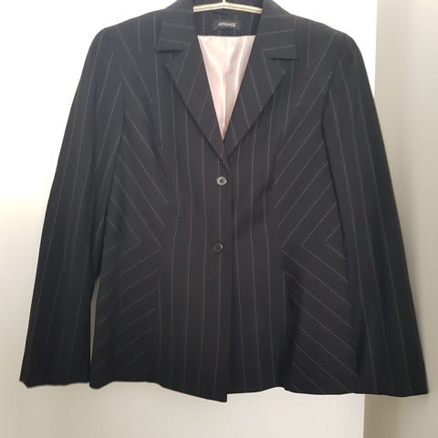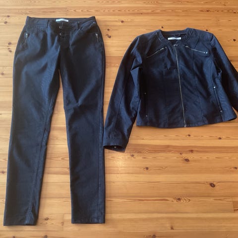PTAn valmistama housupuku raakasilkkiä, jakussa vuori. Housuissa sivuvetoketju ja helmassa koristenauha.