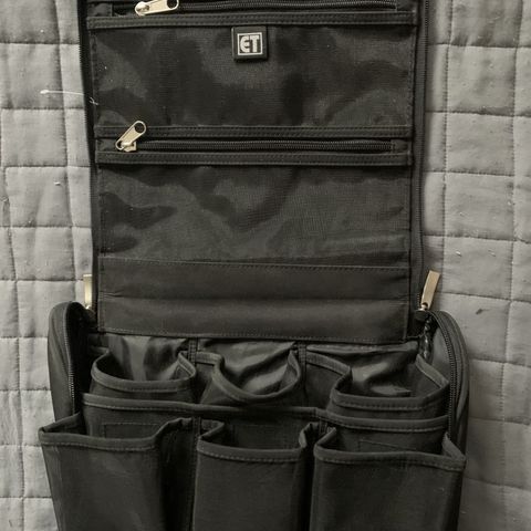 Vihreä toilettilaukku, 4 lokerikkoa sisällä, vetoketjullinen, 3eur. Myynnissä myös musta monilokeroinen toilettilaukku, meikkilaukku