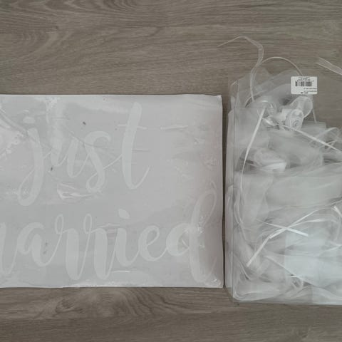 Lisäksi valkoista harsoa 1 rulla, kooltaan noin 1,6 m x 10 m. Yhtenä palana. Toiminut 2 m halkaisijaltaan olevan hääkaaren peittona ja riitti tarkoitukseen hyvin.