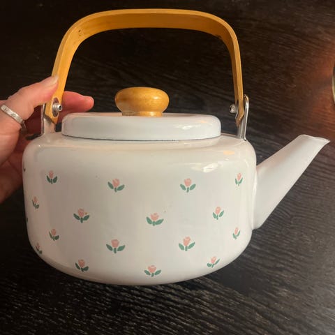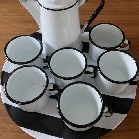 Valkoinen emali astiasto, iso tee/ kahvipannu kannella ja 6 emalimukia, yht 60eur
