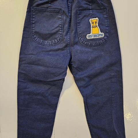 Mini Rodinin housut, koko 92/98. Hyvässä kunnossa, mutta polvessa tahra ja takana pieni punainen tahra. Vyötäröllä säätömahdollisuus. Väri persikkainen.