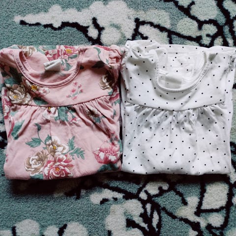 Uusi puna-valko-raitainen asu: t-paita ja hame, jossa kiinteät housut. Nepparit olkapäillä ja haarassa. Koko 74 cm, Merkki Dirkje. Materiaali 95 % puuvilla, 5 % elastaani. Uusi, laput kiinni.
