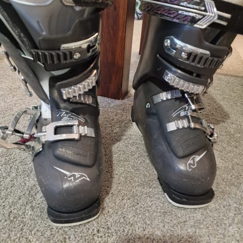 Yksi tai kaksi kertaa käytetyt Nordica Sportmachine laskettelumonot, koko 24,5 eli n. 39. Väri valkoinen/violetti.