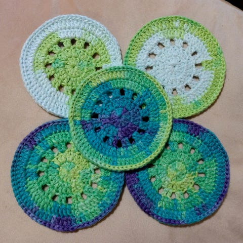 Löytyy kaksi, neljän kappaleen settiä. Lanka 100% puuvilla, pesu 60 astetta. Halk 10 cm