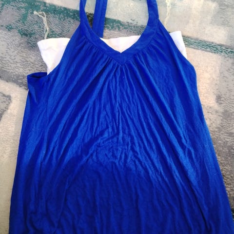 Turkoosi toppi, koko 44/46. Tosi joustava materiaali. Olkaimien pituutta saa säädettyä. Hyvässä kunnossa.