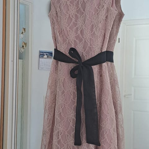 Vuorellinen, vadelmanvärinen juhlamekko. Merkki Selection by s. Oliver. Takana vetoketju.