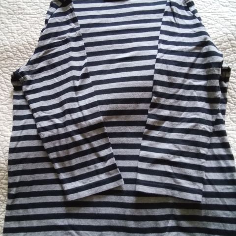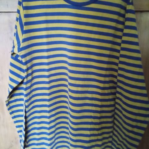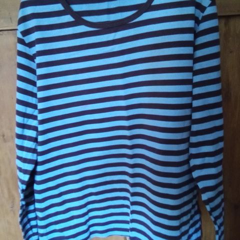 Viininpunainen-oliivinvihreä raitapaita. Pari huomaamattomasti korjattua reikää, muutoin siisti