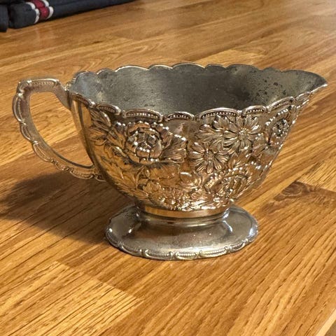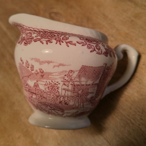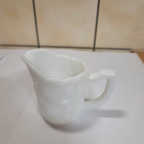 Vanha kermakko, kaunis sininen kukkakuviointi, ei tietoa valmistajasta? Kaatonokassa vähän rosoa reunassa, korvan juuressa näkyy halkeama (onkohan ollut aina?), pohjassa ei mitään leimaa. Kuvissa näkyy virheet.