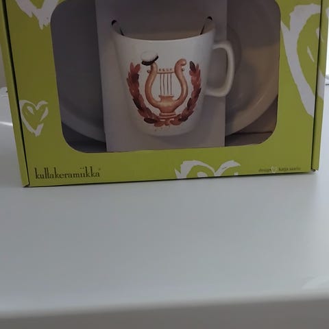 Kaksi aamiaissettiä sinistä kultakeramiikkaa, käyttämättömiä, virheettömiä.