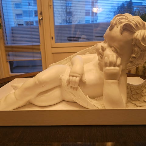 Vanha kipsienkeli, saanut kolhuja ajan saatossa.