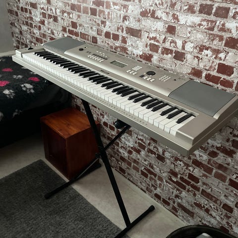 Kunnossa oleva sähköpiano. Johto on melko huonossa kunnossa, mutta pattereilla toimii hyvin.