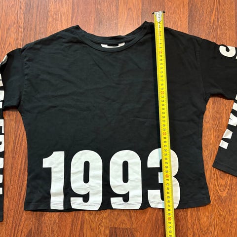 Musta pitkähihainen paita, jossa edessä tasku tekstillä koossa 160 cm.