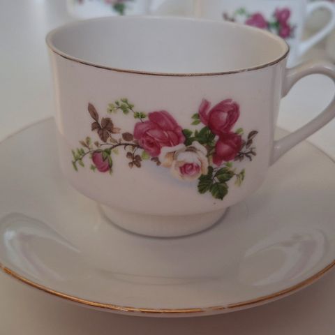 Tsekkoslovakialaista posliinia. 6 kuppia, 6 pullalautasta, 5 tassia (puuttuu siis 1 tassi) 1 pieni kermakko. Astiat ehjiä ja siistejä. Nouto Hämeenlinna myllymäki.