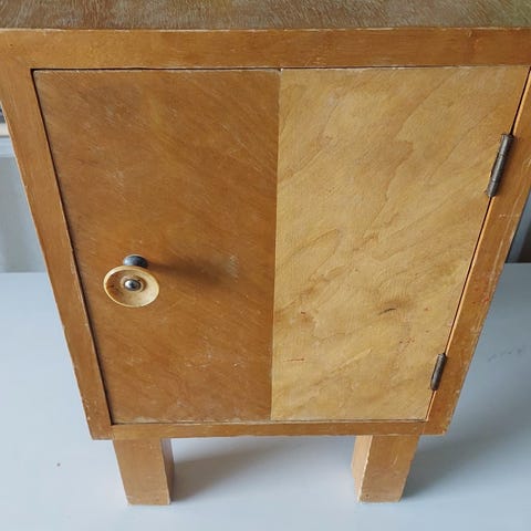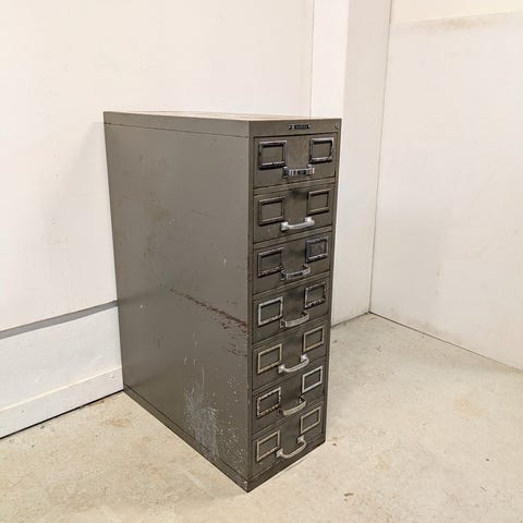 Todennäköisesti 1930-luvulta oleva näyttävä ja painava peltinen korttiarkistokaappi. Väri tummaoliivi-/army-vihreä. Pintaruostetta paikoissa, joista maali käytössä kulunut. Sisällä joitakin vanhoja varastokirjanpitokortteja, näiden perusteella ajoitettu tuonne 30-luvulle. Suurimmassa osassa vetolaatikoita on indeksointikorttitaskut tallessa, mutta ei kaikissa. Vetolaatikoissa sarana, jolla laatikon saa taitettua alas. Laatikot saa myös kokonaan pois. Laatikoiden sisäkorkeus on noin 1,5 cm. Lukitus toimii. Avain ei ole alkuperäinen, mutta lukko on.