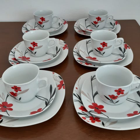 Hyväkuntoiset ja ehjät valkoiset kahvikupit ja tassit. Kuusi paria. Kupin vetoisuus 2,5dl. Vain nouto.