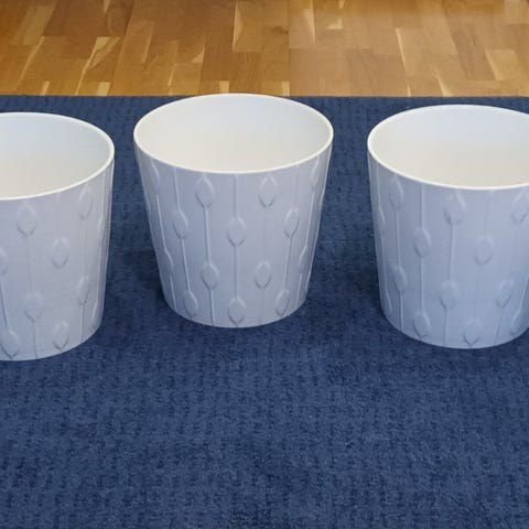 - Kaksi ruukkua: Pyöreä, kullanhohtoinen.Kork. 12 cm, ylähalk. 12 cm sekä valk. lasia. Kork. 11 cm, ylähalk. 12 cm.
