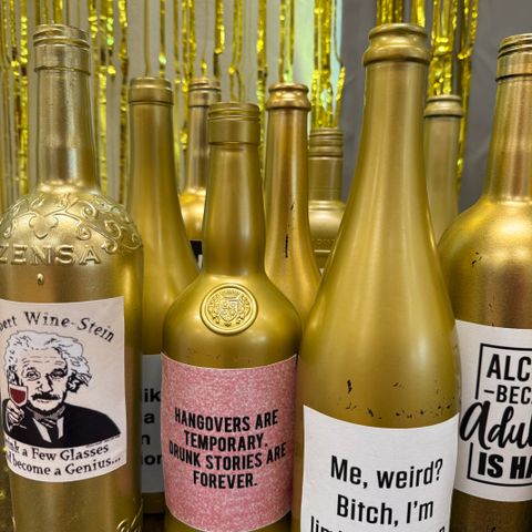 16 kpl kultaiseksi maalattuja pulloja. Pullot erilaisia ja rustiikkisia. Meillä ollut häissä pöytäkoristeina.