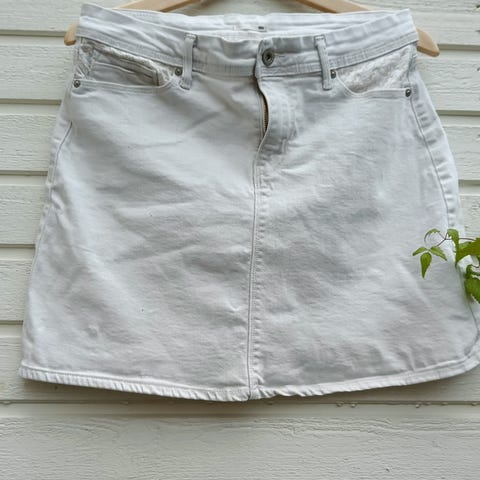 Myydään valkoinen, Leviksen vintage 501 -farkuista ammattiompelijalla tuunattu farkkuhame. Koko W:26 ja pituus 160-senttiselle nilkkapituinen. Takana halkio. Laadukasta paksua farkkukangasta.