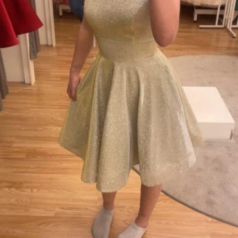 Rippijuhlapäivänä kesällä 2024 käytetty mekko. Moitteeton kunto. Pieni koko mutta nyörityksen ansiosta 34/36. Väri light gold. Selässä nepparikiinnityksellä kangaspala, jonka voi halutessaan jättää pois, näin selkä avonaisempi. Sivuilla taskut. Ovh 289€