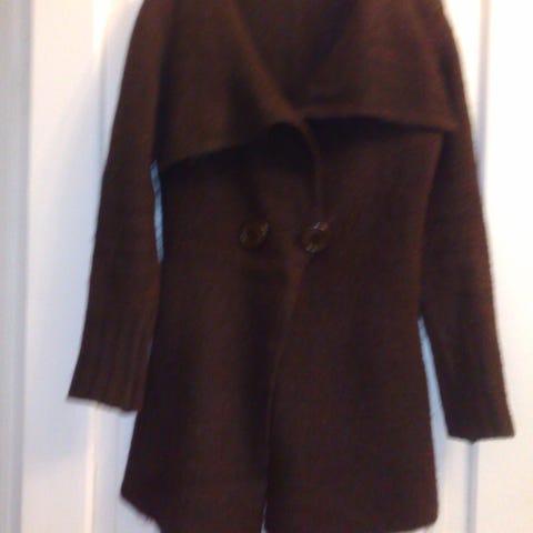 Viininpunainen pitkä neuletakki, jossa halkiot sivuilla. Neuletakin pituus 107 cm. Koko S (reilua kokoa). Moitteeton kunto.
