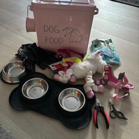 Koiranruokapurkki, korkeus n. 40 cm, kaksi ruostumatonta terästä olevat ruokakipot, toinen vähän isompi, talutin, kynsileikkuri.