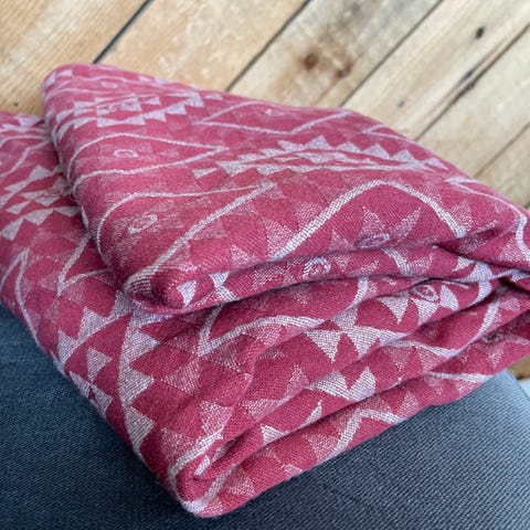 Oschan kantoliina 40% puuvillaa, 60% lampaan villaa. Pysyy hyvin sidonnassa. Sopii pienen ja ison lapsen kantamiseen.